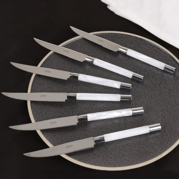 The set of steak knives in the Conty collection is defined by its chrome-plated end cap and well-balanced cylindrical handle, creating an elegant signature inspired by silversmithing that elevates the table without excess. Thoughtfully assembled for convivial meals, it offers a coherent and refined set of knives for clean, confident steak service. Available in several colours, the collection lets you shape a table setting that feels classic, distinctive or more daring as desired. Its presentation and consistency make it as appealing to give as it is to use, especially when the quality of the knives really matters. Choosing this designer steak knife set means opting for a chic, functional piece designed to enhance the table setting over time.