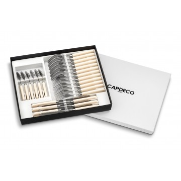 The 24-piece flatware set from the Helios collection stands out for its timeless look as a reimagined classic, bringing a lasting elegance to the table. Designed to equip the whole table with consistency, it brings together the essentials of an elegant and lasting service. Its French blade introduces a different profile to the service while preserving the elegance, balance and coherence of the collection. Its balanced composition simplifies entertaining and helps create a strong visual identity around the table from the very first meal. This designer 24-piece flatware set extends the personality of the collection into the details and gives both daily meals and entertaining a refined, lasting finish.